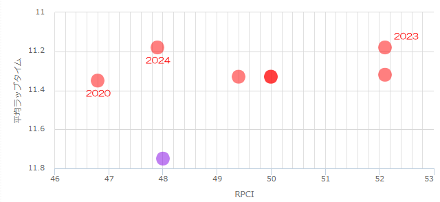 RPCIは47~52のややハイペースよりです。レースタイムはここ2年はどちらも1分7秒1のタイムで今年も同程度になる想定です。