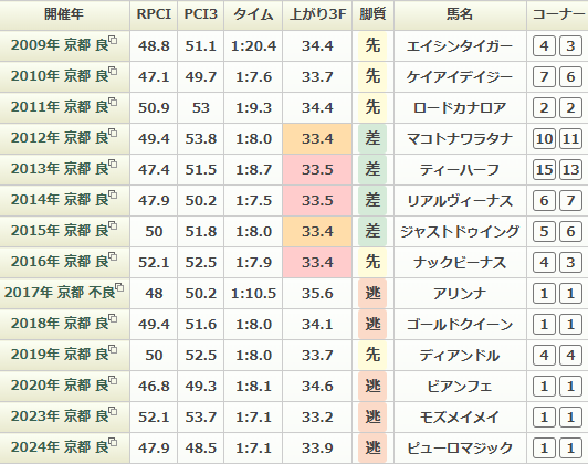 京都競馬場のリニューアル後も2年連続で逃げ馬が勝利している点からも逃げ馬はかなりプラス材料として良さそうです。