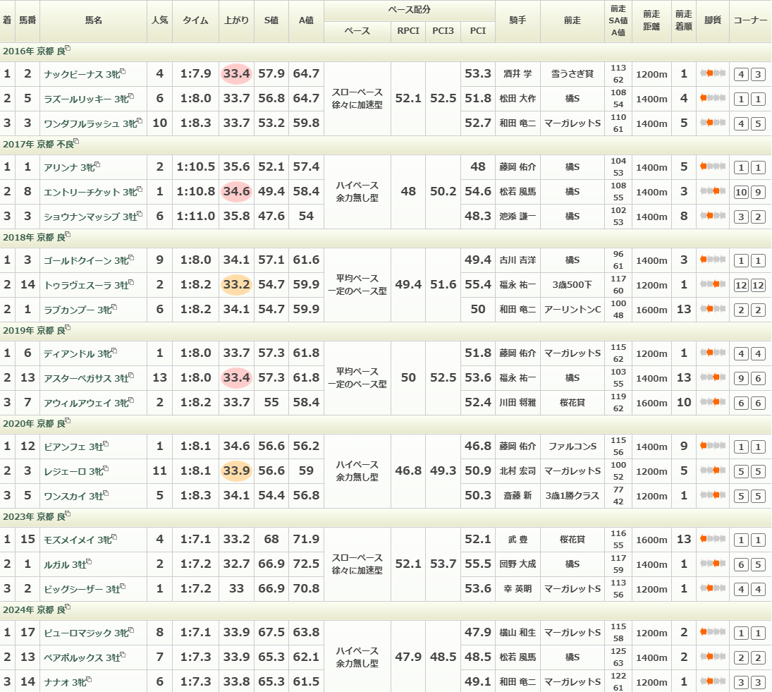 2024年は前三頭がそのまま押し切って勝利。2023年は上がり3Fが33秒0前後の直線でのスピードで押し切っている印象です。
