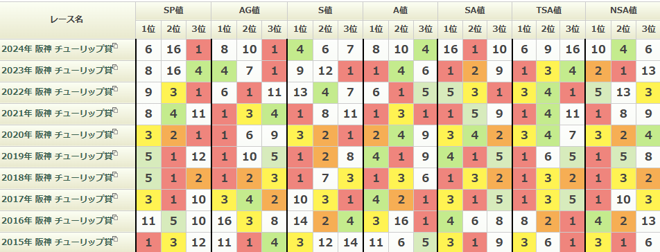 次いでSA値・NSA値・S値2位、TSA値・AG値が3位のビップデイジー、TSA値・A値2位、SA値・NSA値・SP値が3位のナムラクララ。