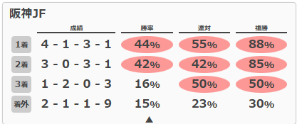 阪神JF2着馬は過去16年で7頭出走していて、3-0-3-1と複勝率85%。