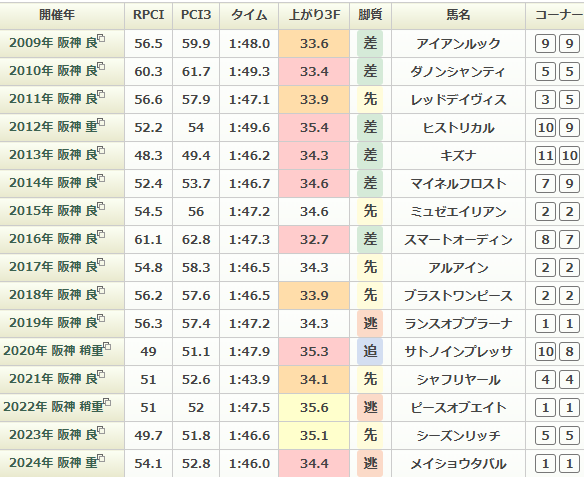 2020年以降はPCI3が52前後になることが多く、消耗戦の中最後まで脚を残せる馬に展開が向いてる。