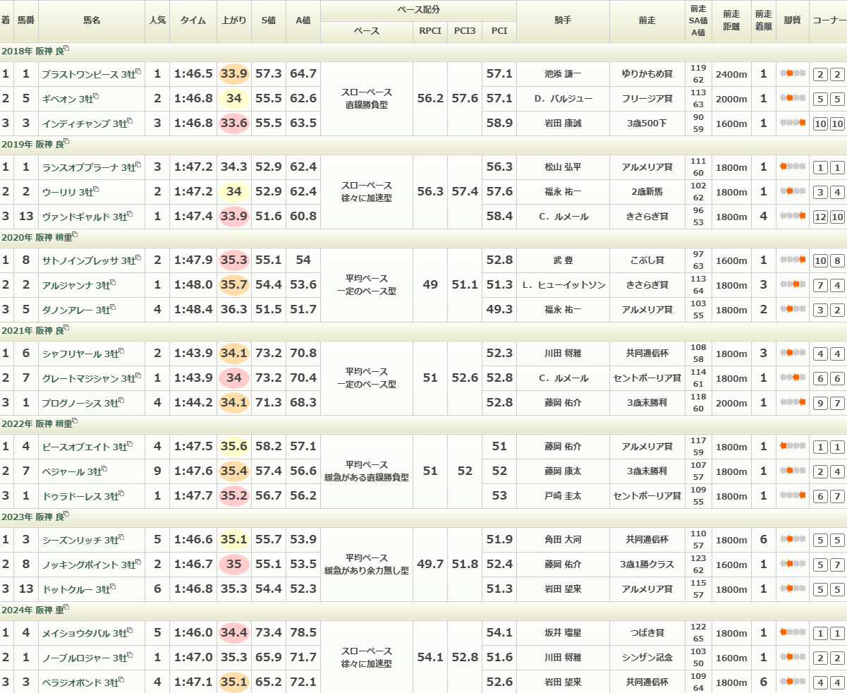 ペース配分は比較的速いペースで進み息の入りづらい上り3F34秒~35秒くらいの展開になることが多い。