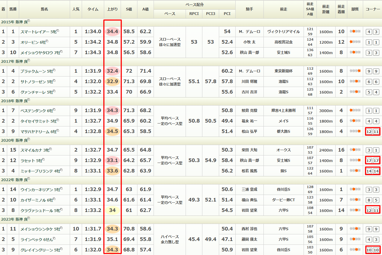過去6年のレースを見てみると、上り3Fの速い馬が馬券に絡み易い傾向です。
