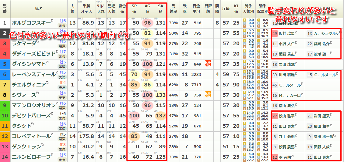 指標の中ではTSA値やNSA値の高い馬が馬券に絡み易い傾向が見られます。
