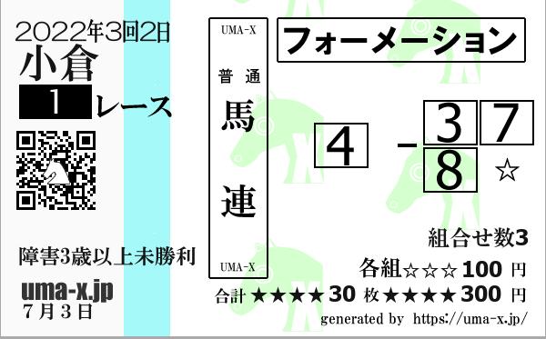 | 2021年 小倉 障害3上未勝利 | 6 | 7 | 4 | 1 | 8 | 6 | 1 | 2 | 7 | 8 | 6 | 2 | 7 | 8 | 1 | 1 | 6 | 2 | 7 | 8 | 6 | 1 | 2 | 7 | 8 | 1 | 7 | 6 | 2 | 8 | 6 | 2 | 1 | 3 | 7 |