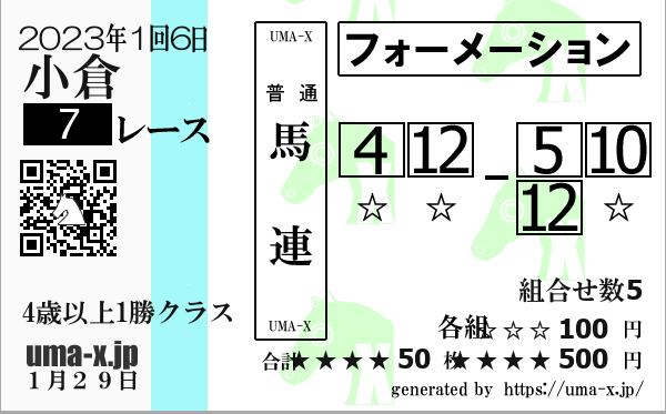 | 2022年 小倉 4上1勝クラス | 11 | 12 | 5 | 9 | 1 | 10 | 8 | 5 | 1 | 6 | 9 | 8 | 1 | 12 | 11 | 9 | 10 | 1 | 8 | 6 | 9 | 1 | 12 | 6 | 5 | 1 | 9 | 6 | 8 | 2 | 14 | 1 | 9 | 12 | 8 |