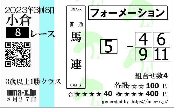 | 2023年 小倉 3上1勝クラス | 5 | 8 | 1 | 4 | 7 | 1 | 5 | 4 | 2 | 8 | 1 | 4 | 5 | 3 | 8 | 5 | 1 | 2 | 3 | 6 | 1 | 5 | 6 | 4 | 3 | 1 | 6 | 4 | 5 | 2 | 4 | 1 | 5 | 2 | 6 |