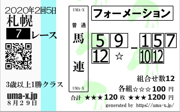 | 2020年 札幌 3上1勝クラス | 4 | 1 | 5 | 3 | 7 | 1 | 3 | 6 | 9 | 5 | 1 | 3 | 7 | 2 | 6 | 1 | 2 | 3 | 7 | 6 | 1 | 3 | 2 | 7 | 6 | 1 | 3 | 6 | 2 | 7 | 1 | 3 | 9 | 2 | 5 |