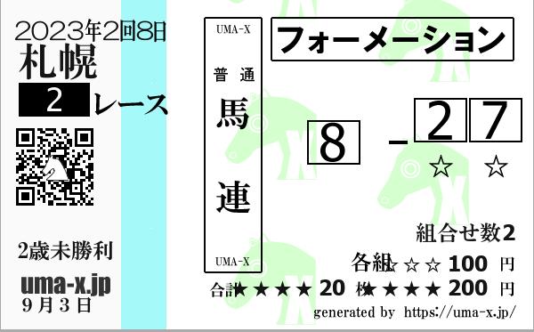 | 2022年 札幌 2歳未勝利 | 1 | 5 | 2 | 8 | 3 | 5 | 2 | 8 | 1 | 3 | 2 | 1 | 5 | 8 | 6 | 2 | 5 | 8 | 1 | 6 | 2 | 5 | 1 | 8 | 6 | 2 | 1 | 5 | 8 | 6 | 2 | 5 | 1 | 8 | 6 |