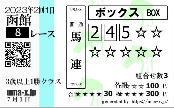 | 2020年 函館 3上1勝クラス | 4 | 2 | 6 | 8 | 1 | 3 | 4 | 1 | 8 | 7 | 2 | 3 | 4 | 6 | 8 | 4 | 3 | 1 | 8 | 6 | 4 | 7 | 3 | 2 | 8 | 4 | 1 | 3 | 6 | 7 | 9 | 4 | 3 | 8 | 1 |
