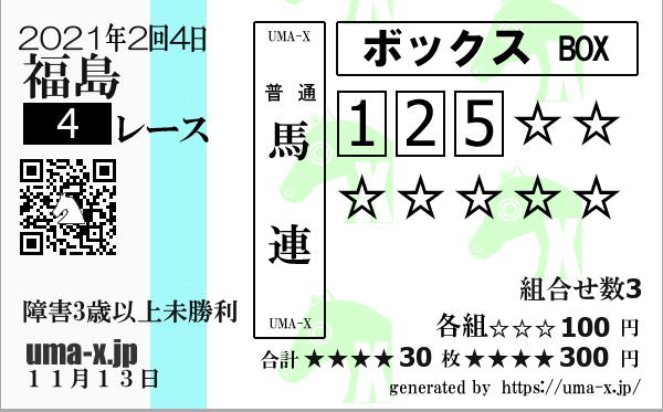 | 2021年 福島 障害3上未勝利 | 8 | 6 | 4 | 3 | 11 | 4 | 14 | 1 | 2 | 5 | 2 | 8 | 7 | 6 | 1 | 4 | 1 | 8 | 2 | 5 | 1 | 5 | 2 | 8 | 4 | 8 | 1 | 4 | 2 | 5 | 1 | 8 | 2 | 14 | 4 |