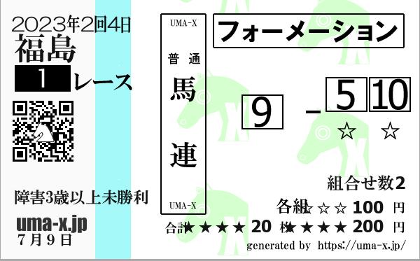 | 2023年 福島 障害3上未勝利 | 4 | 1 | 2 | 3 | 5 | 20 | 4 | 8 | 2 | 7 | 12 | 4 | 3 | 9 | 2 | 12 | 4 | 6 | 11 | 1 | 8 | 4 | 3 | 2 | 9 | 3 | 4 | 8 | 2 | 9 | 8 | 4 | 12 | 3 | 2 |