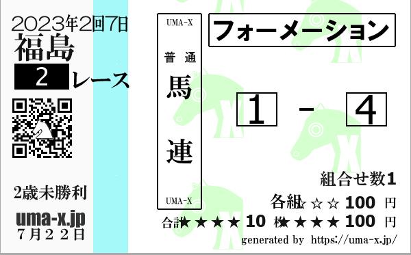 | 2023年 福島 2歳未勝利 | 4 | 3 | 2 | 1 | 5 | 1 | 5 | 2 | 3 | 4 | 4 | 2 | 3 | 1 | 7 | 1 | 2 | 6 | 5 | 3 | 1 | 2 | 4 | 3 | 5 | 2 | 1 | 4 | 3 | 6 | 2 | 1 | 4 | 3 | 5 |
