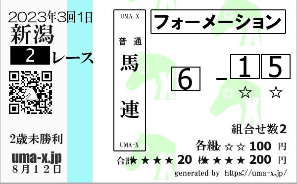 | 2022年 新潟 2歳未勝利 | 2 | 12 | 1 | 5 | 6 | 1 | 5 | 2 | 6 | 11 | 12 | 2 | 5 | 10 | 3 | 2 | 5 | 10 | 1 | 6 | 2 | 5 | 12 | 10 | 8 | 5 | 2 | 10 | 8 | 12 | 2 | 5 | 12 | 10 | 6 |