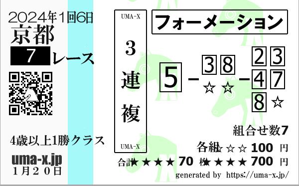 | 2020年 京都 4上1勝クラス | 4 | 2 | 6 | 7 | 1 | 2 | 3 | 8 | 7 | 6 | 2 | 8 | 6 | 4 | 7 | 2 | 8 | 3 | 6 | 4 | 2 | 8 | 4 | 7 | 3 | 2 | 4 | 8 | 1 | 5 | 2 | 7 | 3 | 6 | 4 |