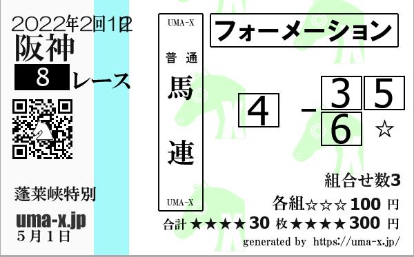 | 2021年 阪神 蓬莱峡特別 | 2 | 6 | 7 | 3 | 5 | 8 | 6 | 3 | 7 | 2 | 6 | 8 | 2 | 3 | 7 | 8 | 2 | 6 | 3 | 7 | 2 | 6 | 7 | 3 | 8 | 8 | 2 | 6 | 3 | 7 | 6 | 2 | 8 | 3 | 7 |