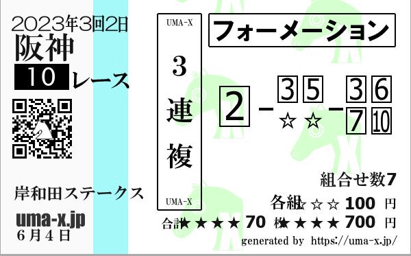 | 2021年 阪神 岸和田S | 6 | 2 | 5 | 7 | 3 | 5 | 1 | 10 | 2 | 4 | 3 | 5 | 6 | 7 | 9 | 3 | 11 | 5 | 2 | 1 | 6 | 3 | 7 | 1 | 4 | 3 | 7 | 6 | 9 | 4 | 6 | 3 | 1 | 5 | 9 |