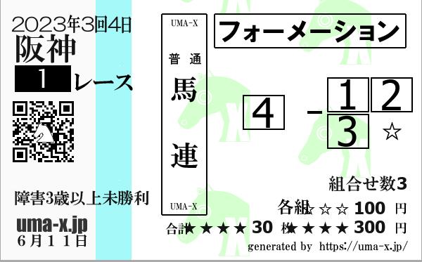 | 2022年 阪神 障害3上未勝利 | 1 | 3 | 2 | 4 | 5 | 3 | 6 | 1 | 2 | 4 | 3 | 6 | 1 | 4 | 2 | 3 | 4 | 2 | 6 | 1 | 3 | 4 | 6 | 1 | 2 | 3 | 4 | 6 | 1 | 2 | 3 | 5 | 6 | 4 | 1 |